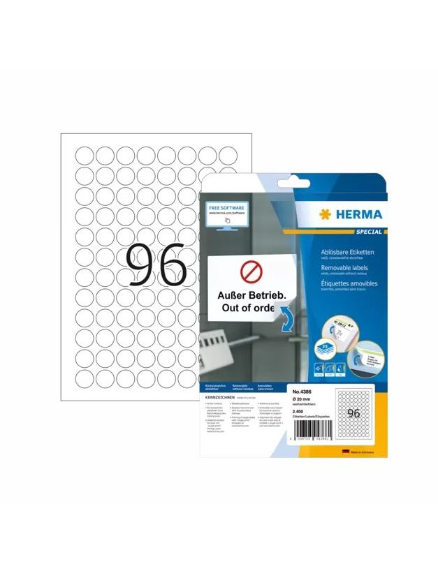 HERMA 4386. Χρώμα προϊόντος: Λευκός (Άσπρος), Τύπος ετικέτας: Αυτοκόλλητη ετικέτα εκτυπωτή, Μορφοποίηση: A4. Πλάτος ετικέτας: 2 cm, Ύψος ετικέτας: 2 cm, Πλάτος φύλλου: 21 cm. Πλάτος συσκευασίας: 212 mm, Βάθος συσκευασίας: 8 mm, Ύψος συσκευασίας: 325 mm. Ετικέτες ανά πακέτο: 2400 τεμάχια, Φύλλα μέσου ανά πακέτο: 25 φύλλα, Ετικέτες ανά φύλλο: 96 τεμάχια. Χώρα προέλευσης: Γερμανία, Χαρακτηριστικά 02: also for 3,5" disk