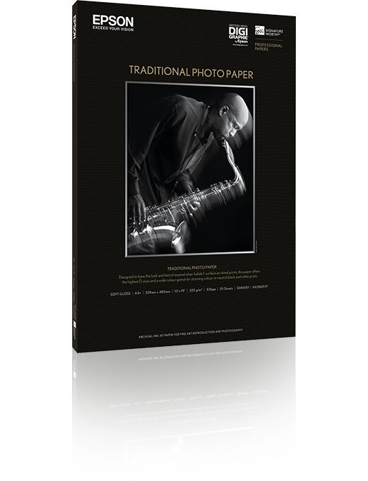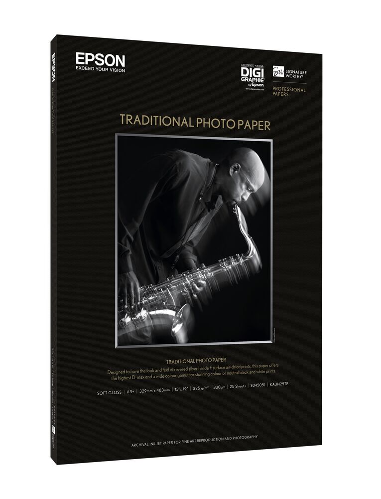 Epson Traditional Photo Paper, DIN A3+, 330g/m², 25 Sheets. Βάρος προϊόντος: 330 g/m², Μέγεθος χαρτιού: A3+, Φύλλα ανά πακέτο: 25 φύλλα. Ποσότητα ανά συσκευασία: 1 τεμάχια, Πλάτος συσκευασίας: 345 mm, Βάθος συσκευασίας: 500 mm. Πλάτος παλέτας (UK): 100 cm, Μήκος παλέτας (UK): 120 cm, Ύψος παλέτας (UK): 88 cm. Χώρα προέλευσης: Ελβετία
