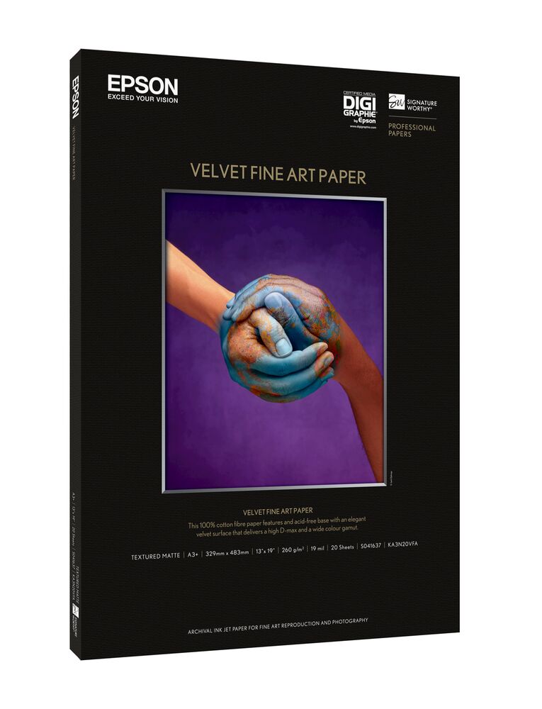 Epson Velvet Fine Art Paper, A3+, 260g/m², 20 Blatt. Προτεινόμενη χρήση: Εκτύπωση με ψεκασμό μελάνης, Μέγεθος χαρτιού: A3+ (330x483 mm), Φύλλα ανά πακέτο: 20 φύλλα. Πλάτος συσκευασίας: 345 mm, Βάθος συσκευασίας: 495 mm, Ύψος συσκευασίας: 19 mm. Πλάτος παλέτας (UK): 100 cm, Μήκος παλέτας (UK): 120 cm, Ύψος παλέτας (UK): 117 cm. Ποσότητα ανά παλέτα: 240 τεμάχια, Χώρα προέλευσης: Ιαπωνία, Ποσότητα ανά συσκευασία: 1 τεμάχια