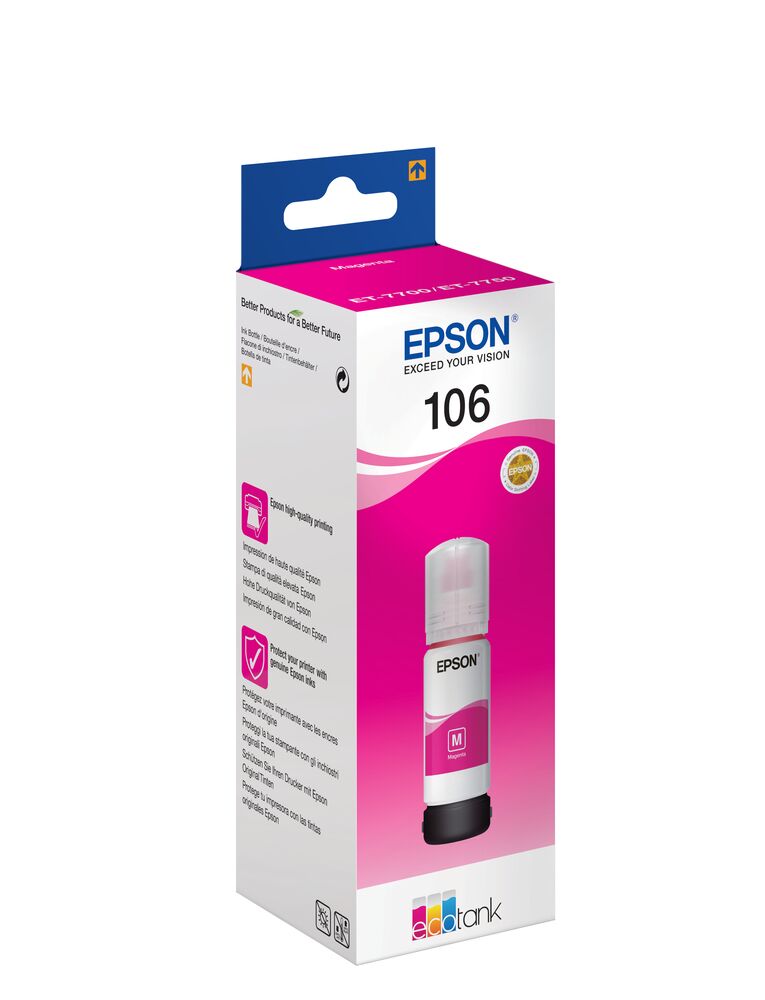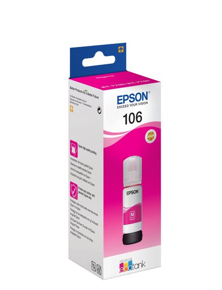 Epson 106. Τύπος: Πρωτότυπο, Τύπος μελανιού: Μελάνι με πιγμέντο, Χρώματα δοχείων μελανιού: Βαθυπόρφυρος. Πλάτος συσκευασίας: 58 mm, Βάθος συσκευασίας: 175 mm, Ύψος συσκευασίας: 58 mm. Ποσότητα ανά παλέτα: 1950 τεμάχια, Πλάτος κύριας συσκευασίας: 32 cm, Μήκος κύριου χαρτοκιβωτίου: 48 cm