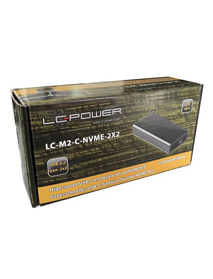 LC-Power LC-M2-C-NVME-2X2. Τύπος προϊόντος: Περίβλημα SSD. Αριθμός υποστηριζόμενων οδηγών αποθήκευσης: 1, Μέγεθος μονάδας αποθήκευσης: M.2, Υποστηριζόμενες διεπαφές συσκευών αποθήκευσης: PCI Express. Ρυθμός μεταφοράς δεδομένων: 20 Gbit/s. Χρώμα προϊόντος: Μαύρος (Μαύρο). Σύνδεσμος USB: USB Type-C