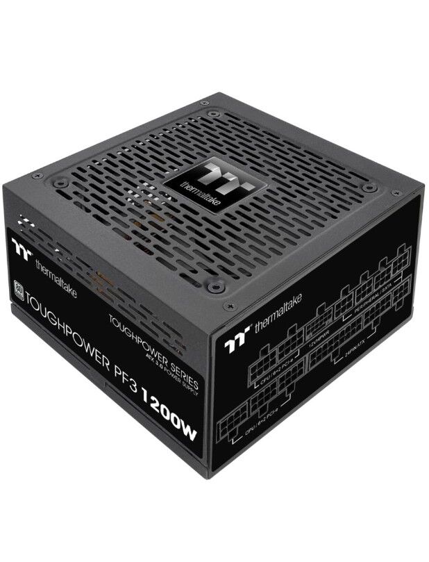 Thermaltake Toughpower PF3. Συνολική ισχύς: 1200 W, Τάση εισόδου AC: 100 - 240 V, Συχνότητα εισόδου AC: 50/60 Hz. Υποδοχή τροφοδοσίας μητρικής πλακέτας: 24-pin ATX, Μήκος καλωδίου τροφοδοσίας μητρικής πλακέτας: 60 cm, Μήκος καλωδίου τροφοδοσίας SATA: 150,500 mm. σκοπός: PC, Συντελεστής μορφής μονάδας τροφοδοτικού (PSU): ATX, Πιστοποίηση 80 PLUS: 80 PLUS Platinum. Χρώμα προϊόντος: Μαύρος (Μαύρο), Τύπος ψύξης: Ενεργός, Διάμετρος ανεμιστήρα: 12 cm. Πλάτος: 140 mm, Βάθος: 150 mm, Ύψος: 86 mm