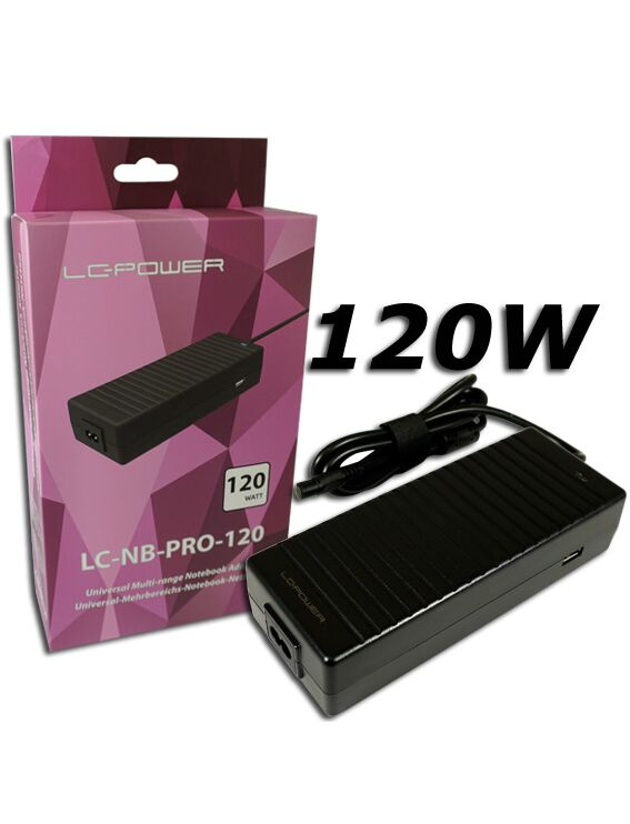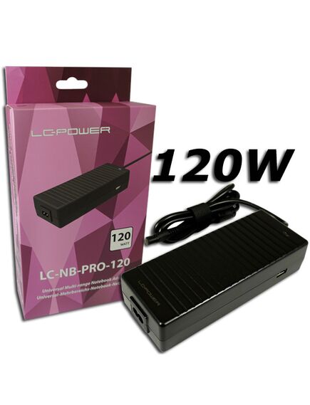 LC-Power LC-NB-PRO-120. σκοπός: Notebook, Τύπος τροφοδοτικού: Εσωτερικός (Εσωτερικού χώρου), Τάση εισόδου: 110-240 V. Χρώμα προϊόντος: Μαύρος (Μαύρο), Υλικό περιβλήματος: Πλαστικός. Μήκος καλωδίου: 1,2 m, Πλάτος: 170 mm, Βάθος: 65 mm. Ποσότητα ανά συσκευασία: 1 τεμάχια, Συμπεριλαμβάνονται καλώδια: AC, Πλάτος συσκευασίας: 246 mm