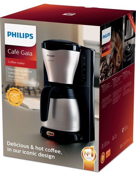 Philips Café Gaia Collection HD7546/20. Τύπος προϊόντος: Καφετιέρα φίλτρου, Χωρητικότητα δεξαμενής νερού: 1,2 L, Τρόπος εισαγωγής καφέ: Αλεσμένος καφές, Χωρητικότητα σε κούπες: 15 κύπελλα. Ισχύς: 1000 W. Χρώμα προϊόντος: Μαύρος (Μαύρο)