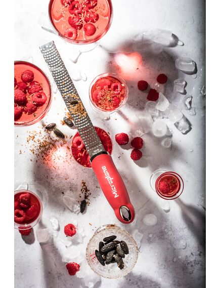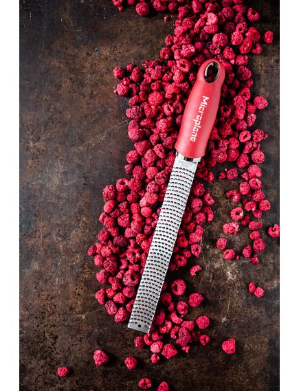 Microplane Zester. Τύπος προϊόντος: Ράσπα τρίφτης, Χρώμα προϊόντος: Κόκκινο, Ανοξείδωτο ατσάλι, Υλικό: Ανοξείδωτο ατσάλι. Χώρα προέλευσης: Ηνωμένες Πολιτείες. Πλάτος: 35 mm, Βάθος: 30 mm, Ύψος: 325 mm. Ποσότητα ανά συσκευασία: 1 τεμάχια