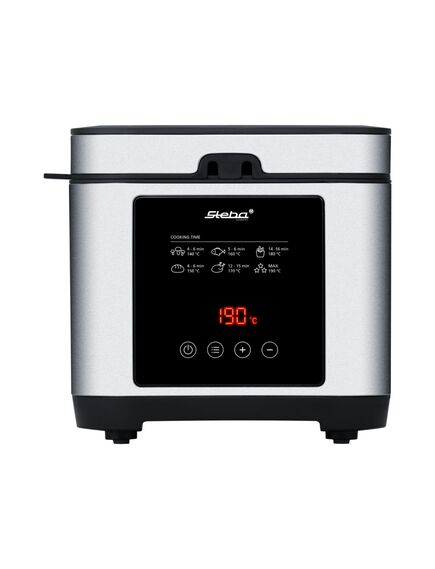 Steba DF 150. Τύπος προϊόντος: Βαθύ τηγάνι, Χωρητικότητα: 2,5 L, χωρητικότητα φριτέζας: 0,8 kg. Τύπος κατασκευής: Μονός, Χρώμα προϊόντος: Μαύρος (Μαύρο), Ανοξείδωτο ατσάλι, Τύπος ελέγχου: Αφής. Ισχύς: 1200 W, Τάση εισόδου AC: 230 V. Πλάτος: 255 mm, Βάθος: 260 mm, Ύψος: 245 mm
